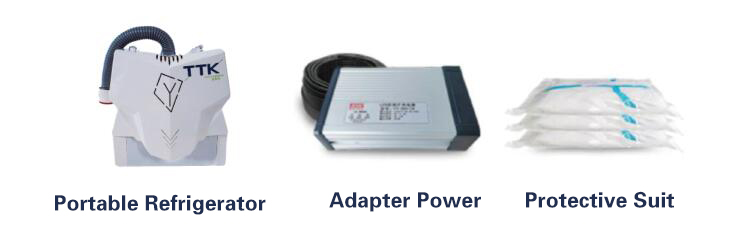 Controllare l'integrità degli indumenti protettivi e utilizzare uno strumento di perforazione speciale per creare buchi negli indumenti protettivi. Abbigliamento protettivo e aria condizionata come mostrato a destra. Dopo aver controllato la tenuta dell'aria, regolare la fascia elastica per adattarsi alle dimensioni del corpo. Indossare guanti medici. Premere il pulsante di accensione per raffreddarlo.